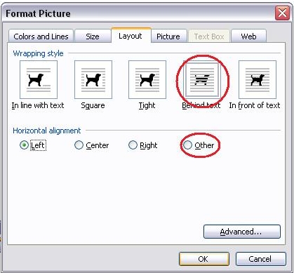 5.Attention:When you insert the watermark, the layout of your context would be disorder. Do not be nervous, continue the next step, the context would be restored. 6.In the Format Picture window, select <Layout>,then click on the <Behind text> and then <Other>, finally click on <Advance...>
