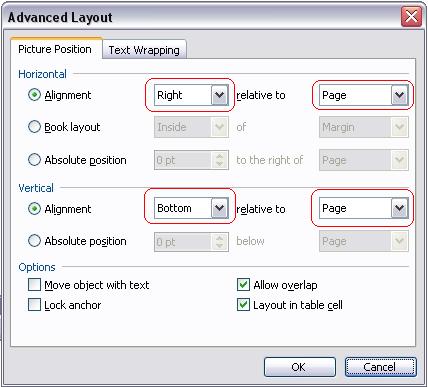 7. When click on the <Picture Position> of the topmost menu bar to bring up its configuration page. For the Horizontal configuration, choose <Alignment> and choose Right and Page respectively for the two fields of this configuration. For the Vertical configuration, also choose <Alignment> and choose Below and Page respectively for the two fields of this configuration.