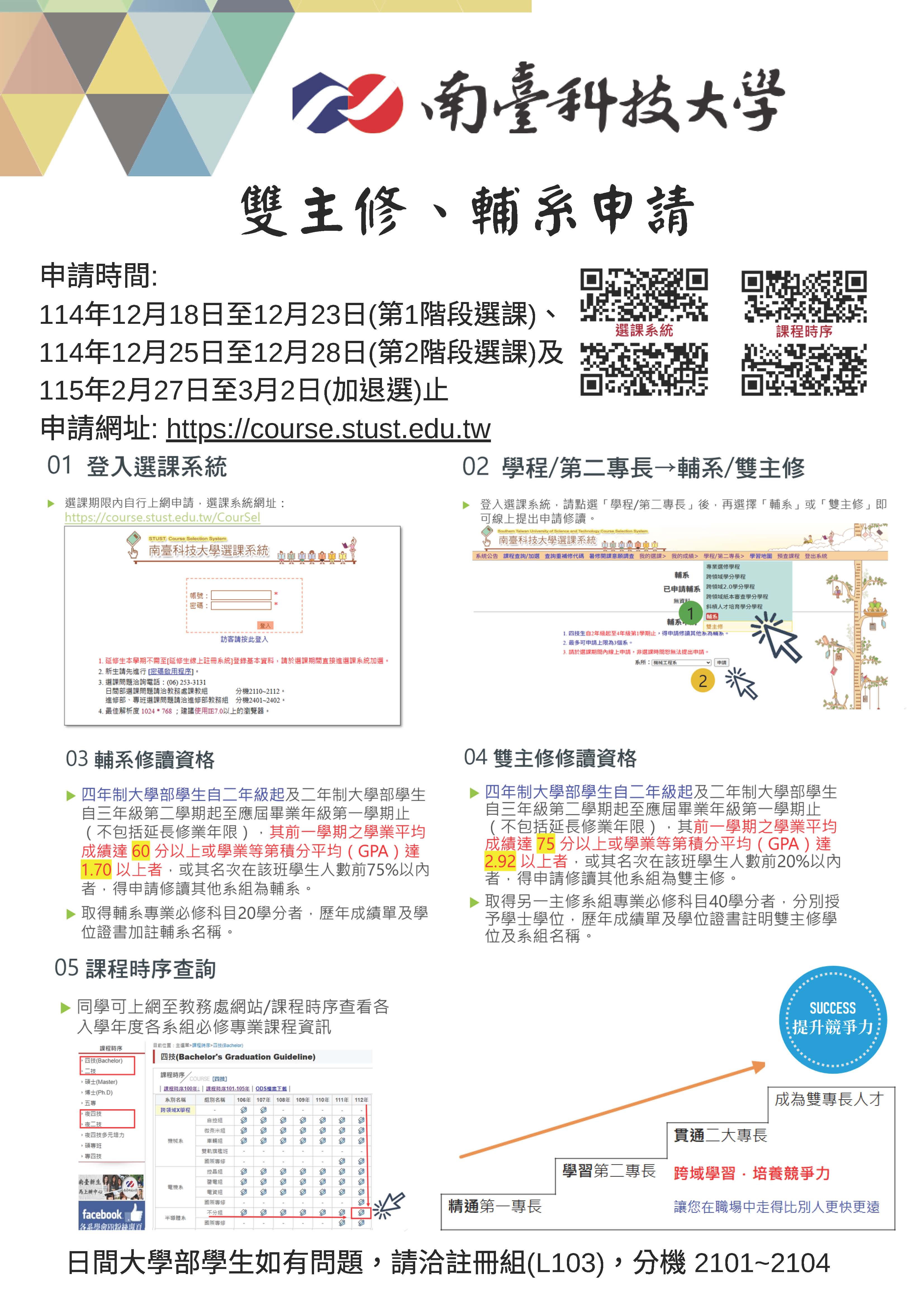 二、欲申請修讀輔系或雙主修的同學可於第1階段選課(12月18日至12月23日)、第2階段選課(12月25日至12月28日)及加退選(115年2月27日至3月2日)登入選課系統線上提出申請。